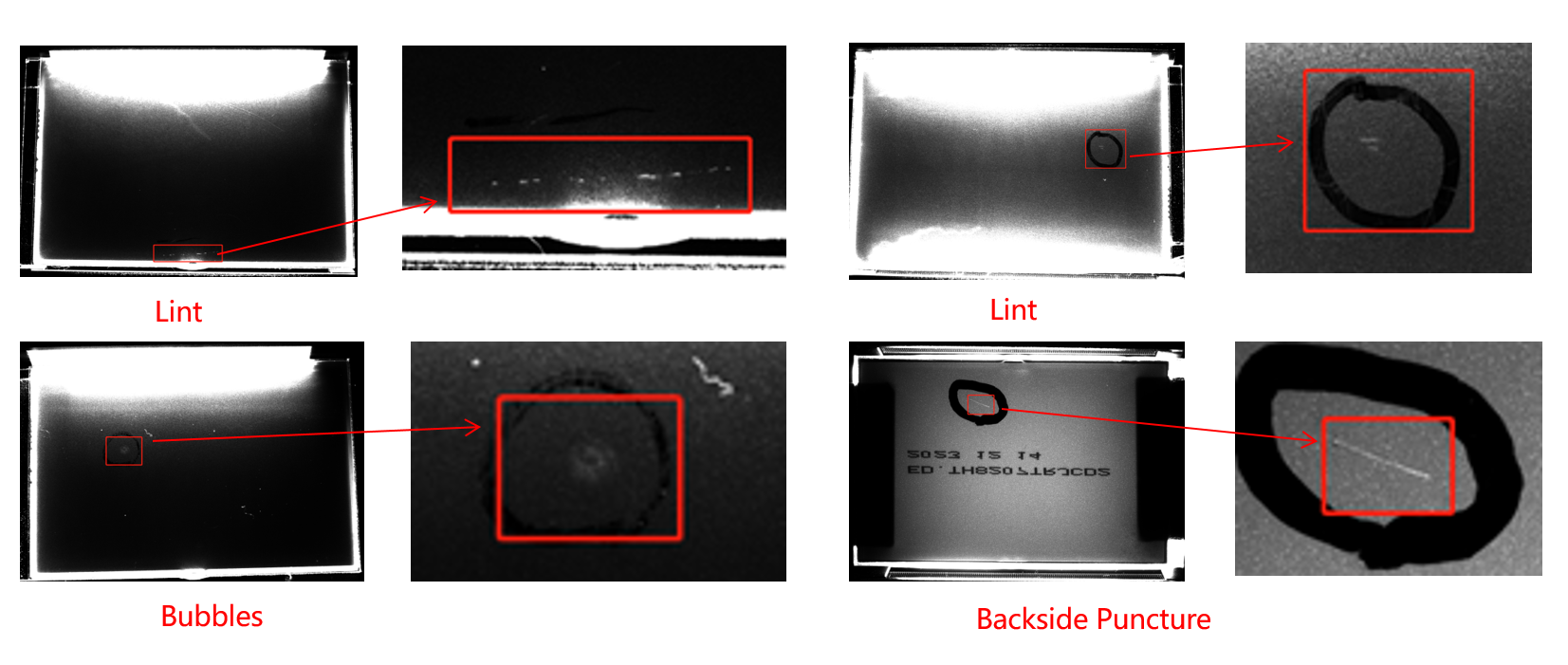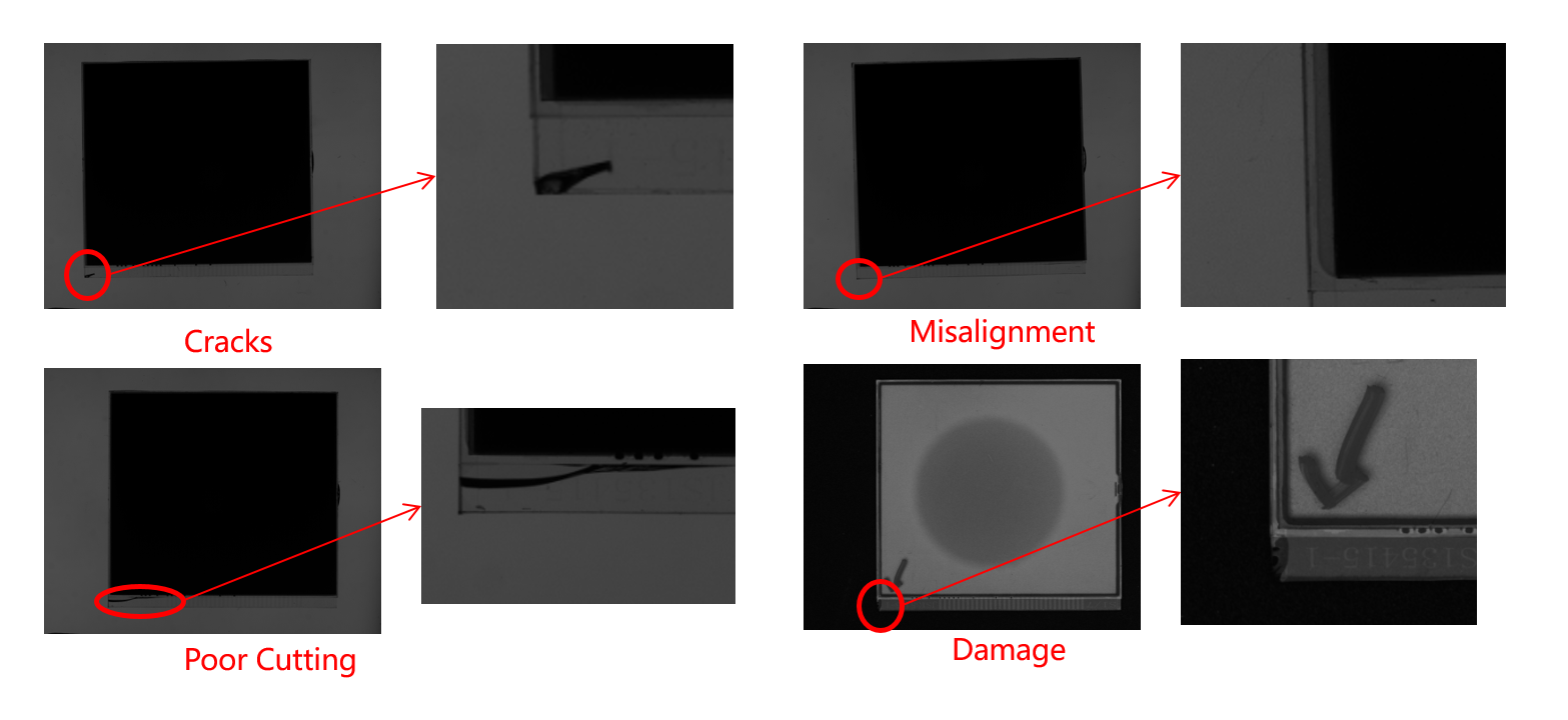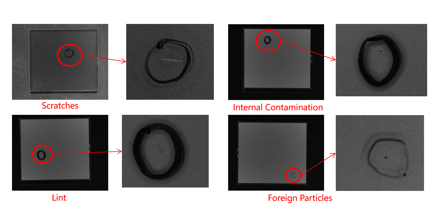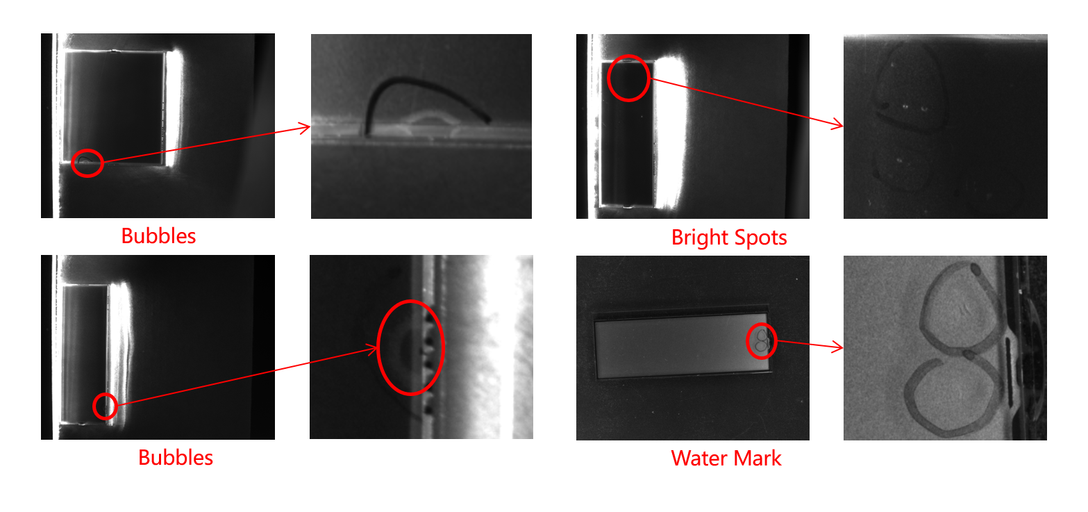 | Defect Detection | Defects including scratches, fibers/lint, internal contamination, bubbles, foreign particles, cracks, poor cutting, misalignment, white spots, water marks, breakage, etc. | ||